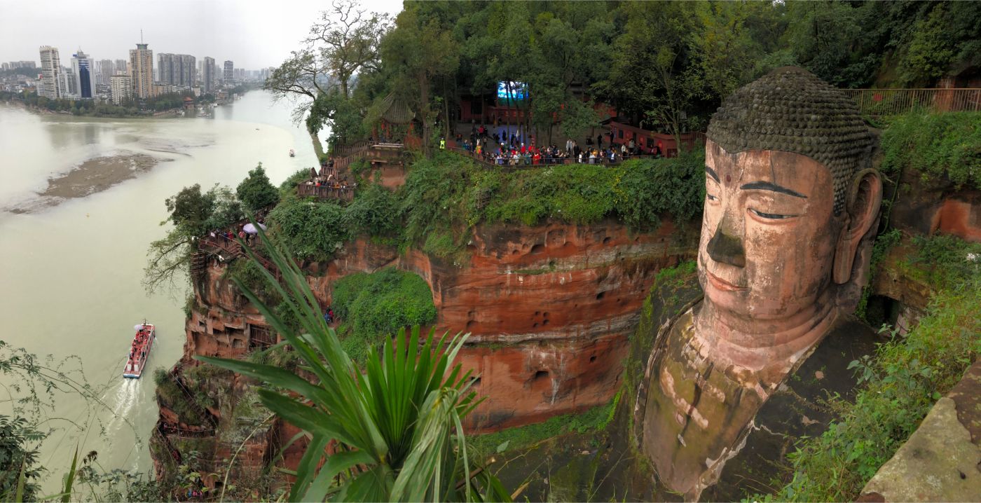 A city called Leshan, home to a 71metre, 1,300 year old giant Buddha, built within the side of a cliff.